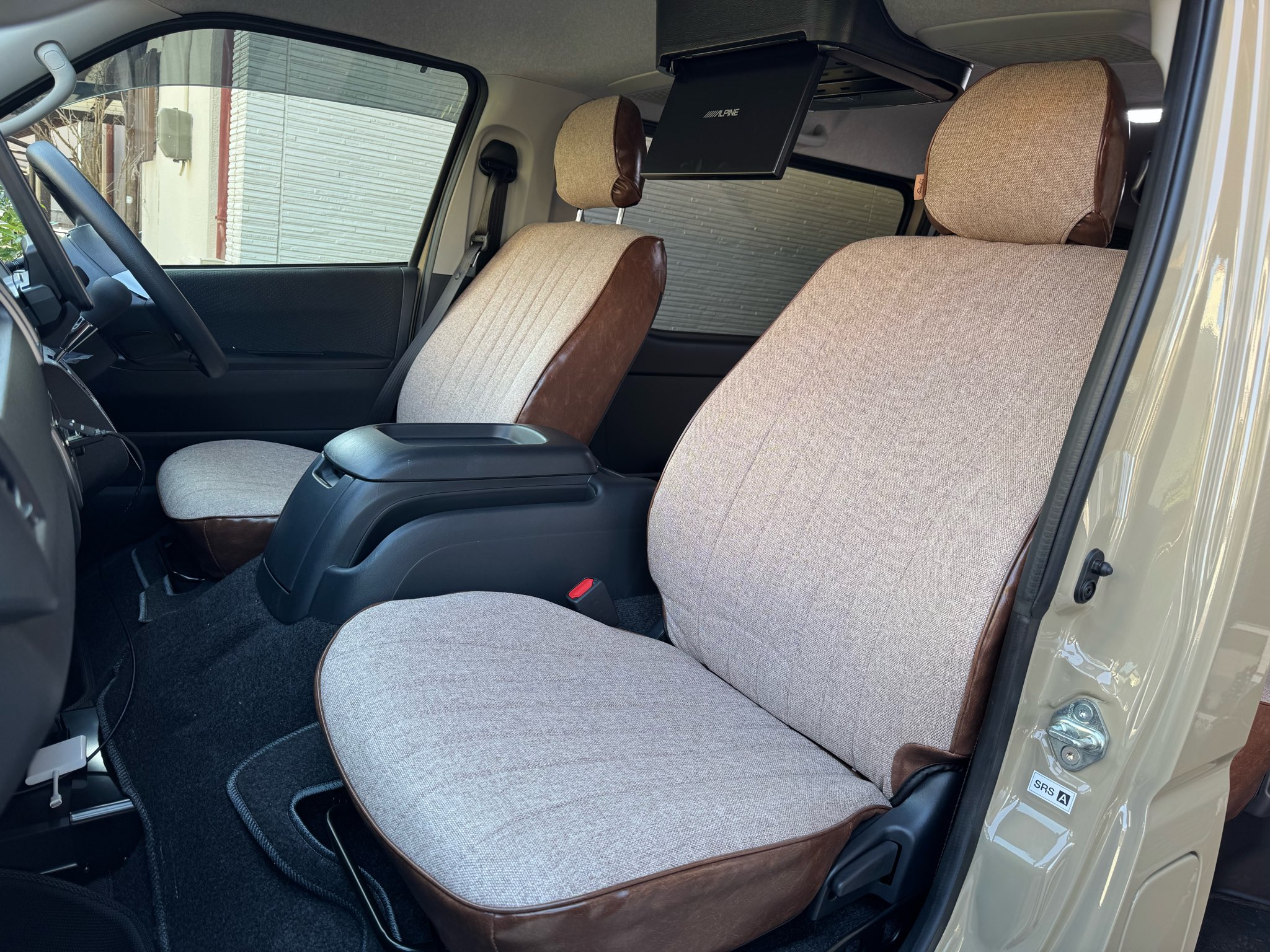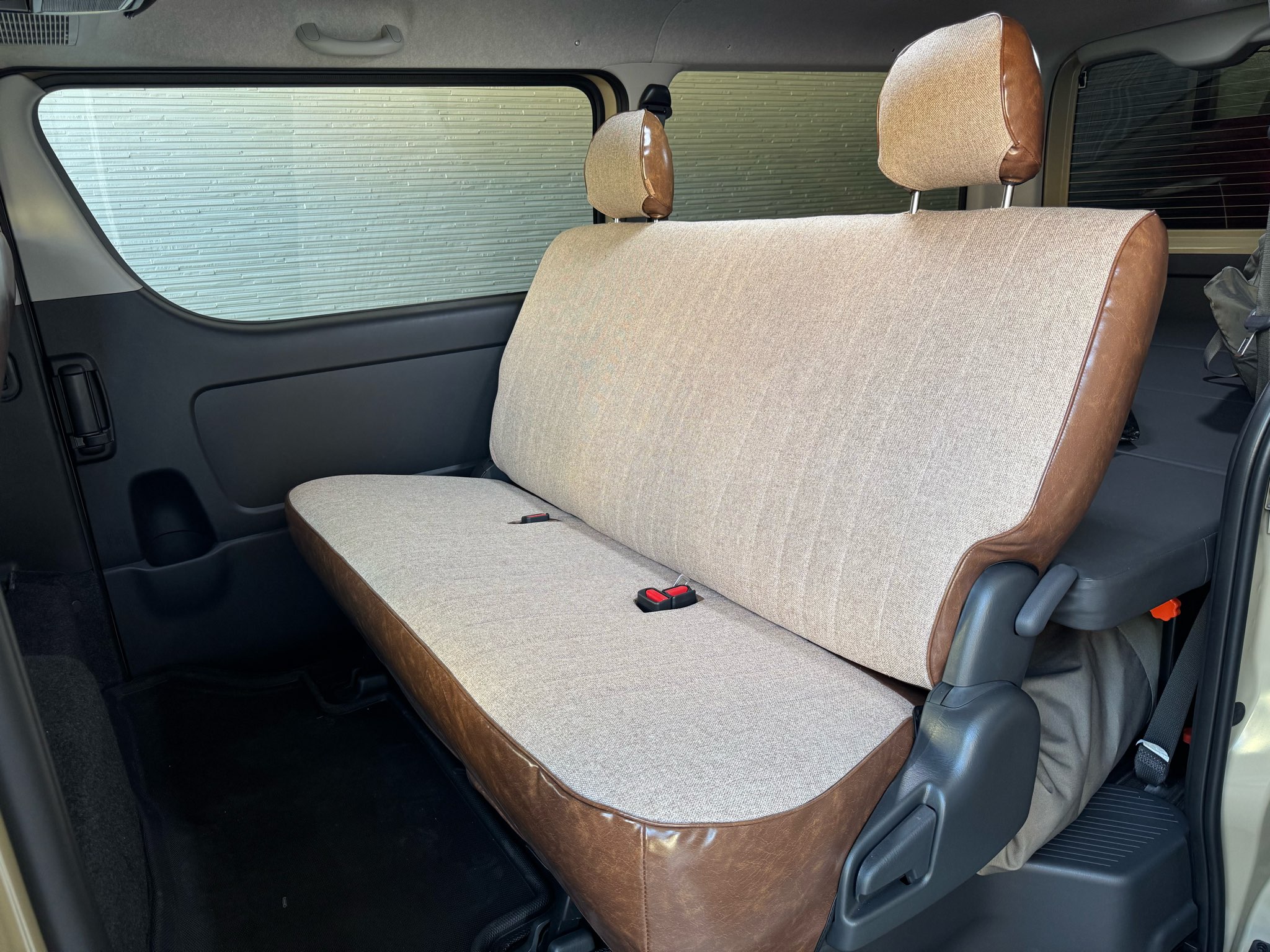 ハイエースボディーカラー(ベージュ)とシートカバーが絶妙にマッチしておりカッコいいです。