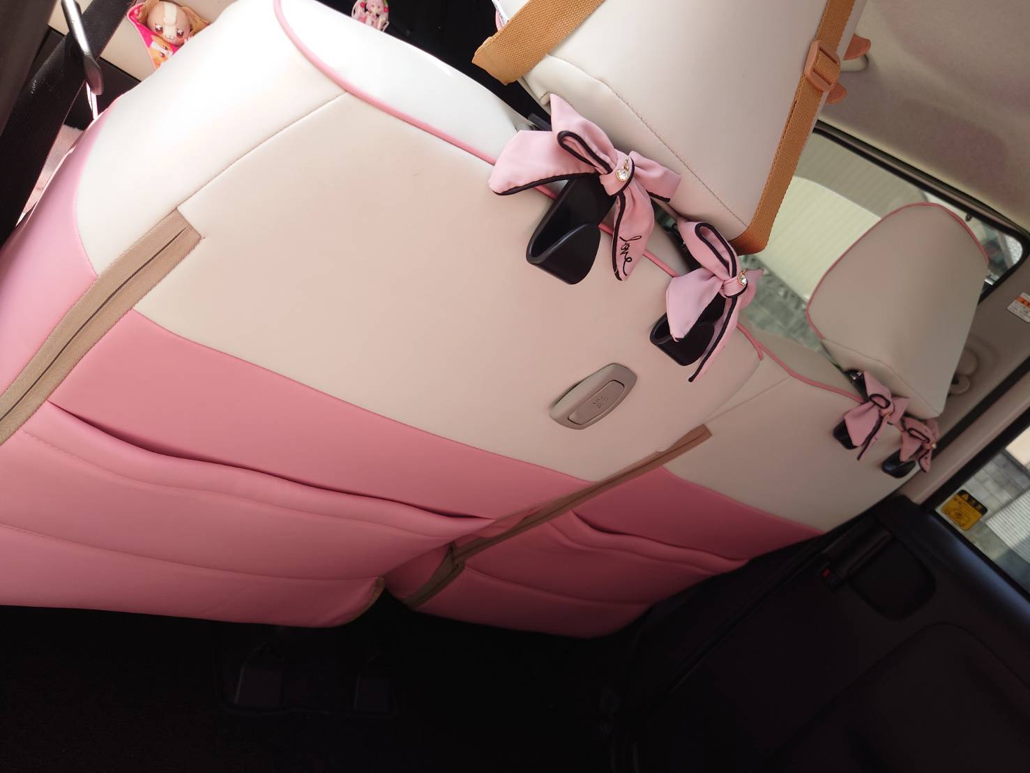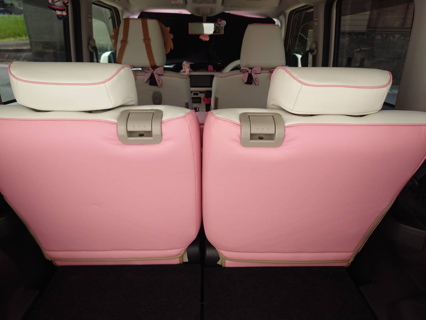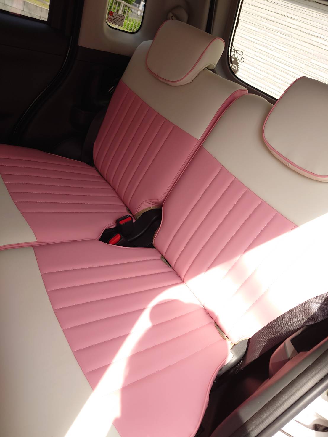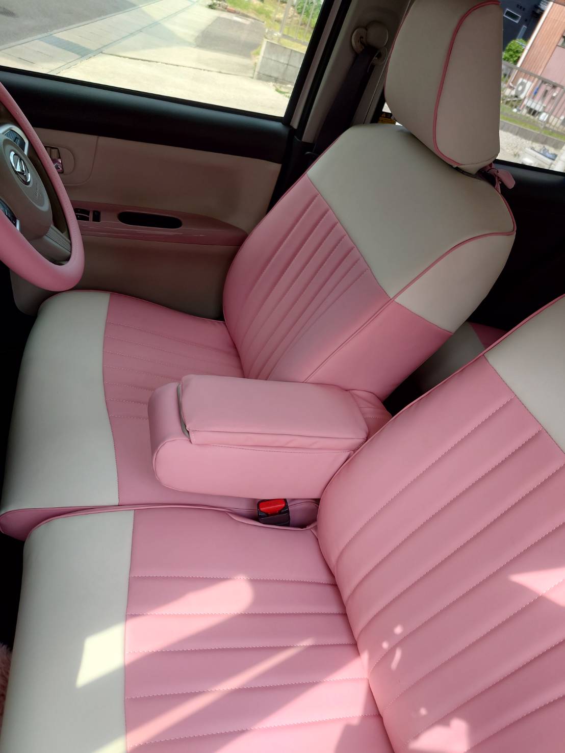 ムーヴキャンバスにピーチピンクのシートカバーを付けさせて頂きました。ピンクのキャンバスなので統一感もあって凄く可愛いです!内装も好みの色合いに出来たので満足しています。